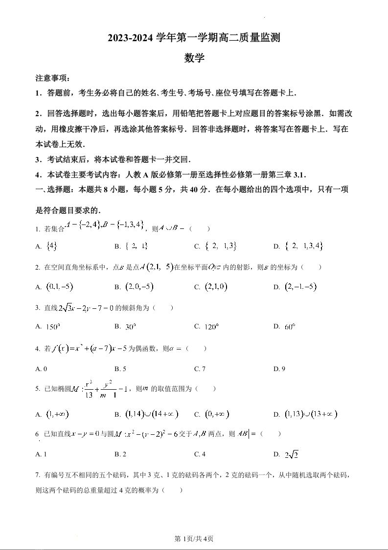 贵州省六盘水市水城区2023-2024学年高二上学期12月月考数学(原卷版)