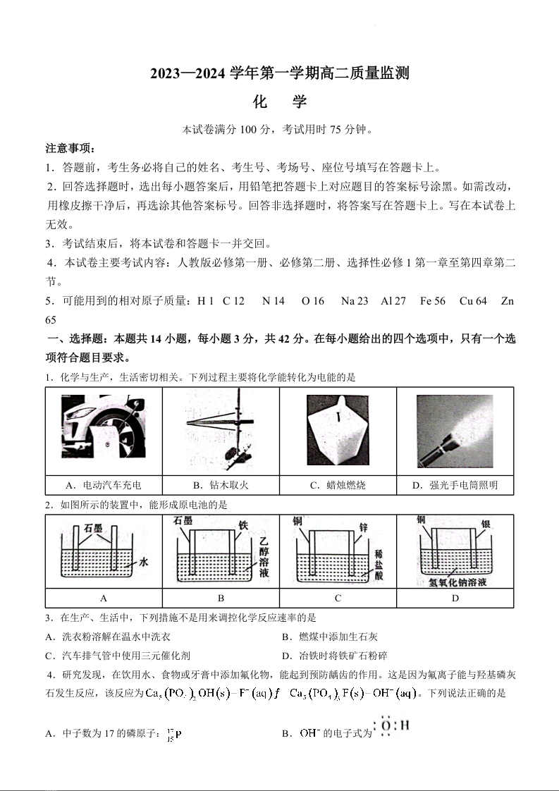 贵州省六盘水市水城区2023-2024学年高二上学期12月月考化学+答案