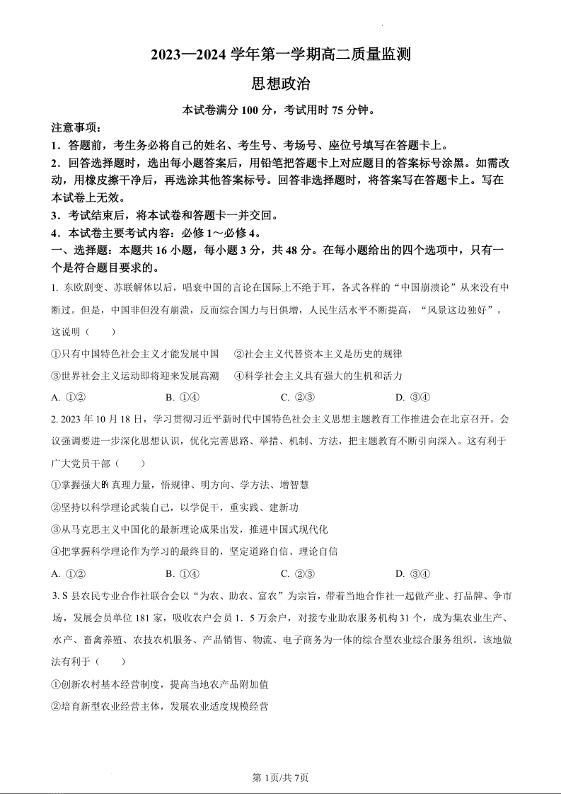 贵州省六盘水市水城区2023-2024学年高二上学期12月月考政治(原卷版)