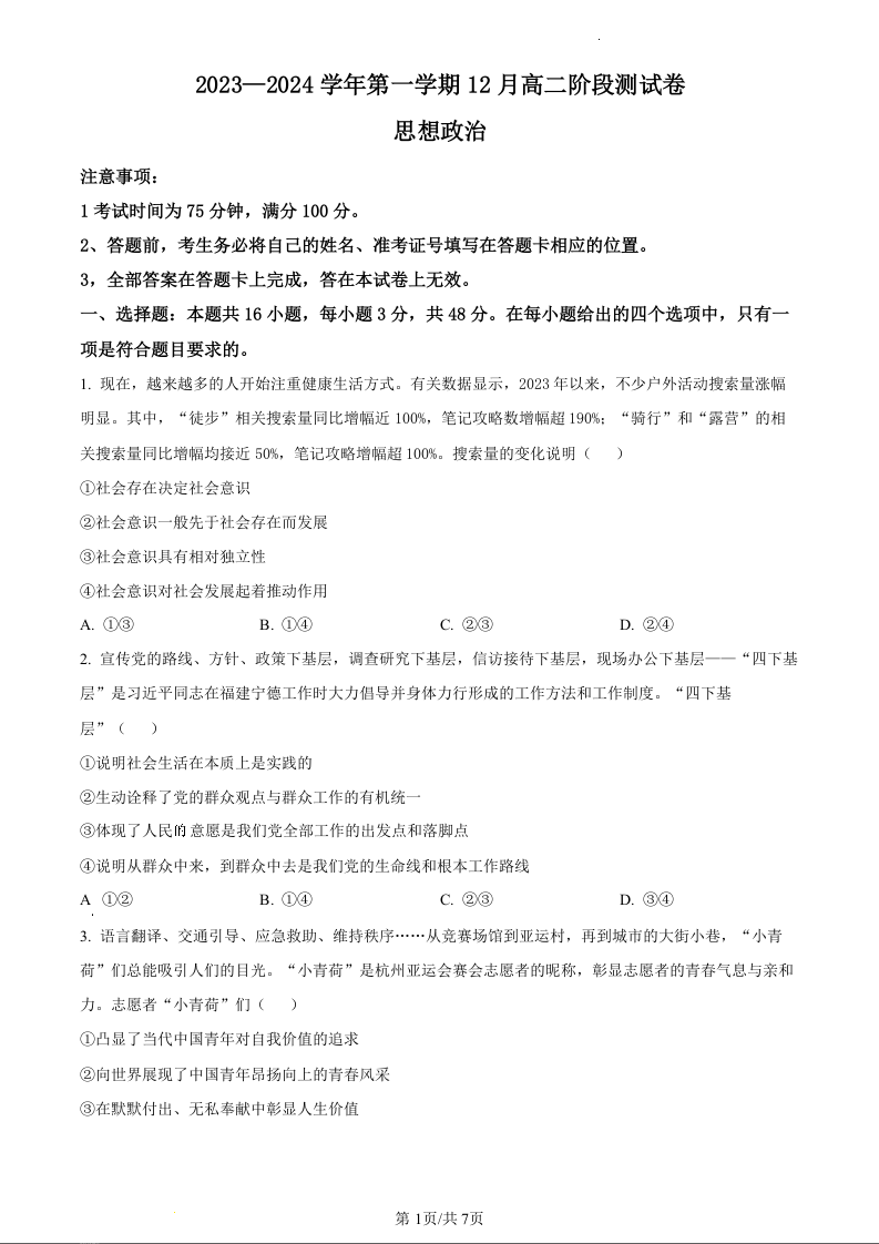 河北省保定市部分学校2023-2024学年高二上学期期中考试政治(原卷版)