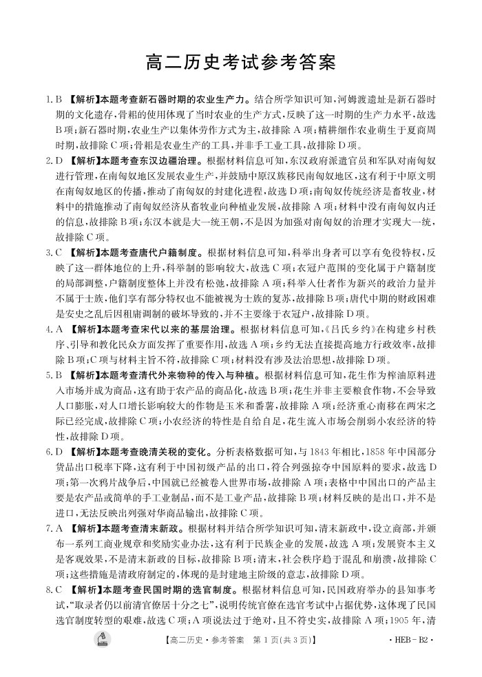 河北省保定市部分学校2023-2024学年高二上学期期中考试历史答案