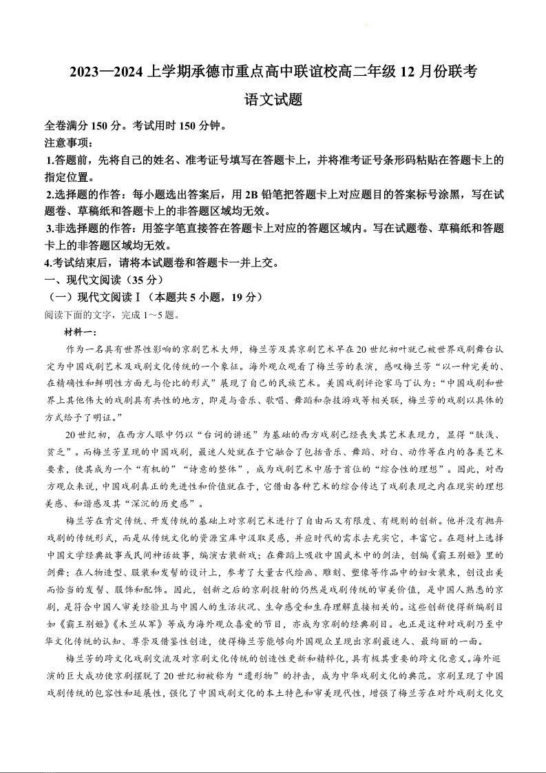 河北省承德市重点高中联谊校2023-2024学年高二上学期12月联考语文