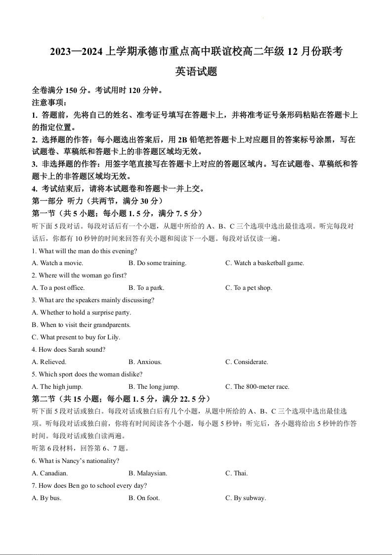 河北省承德市重点高中联谊校2023-2024学年高二上学期12月联考英语