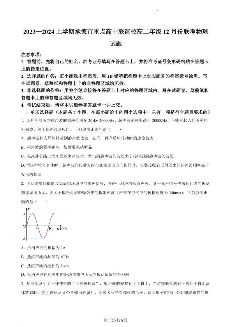 河北省承德市重点高中联谊校2023-2024学年高二上学期12月联考物理(原卷版)
