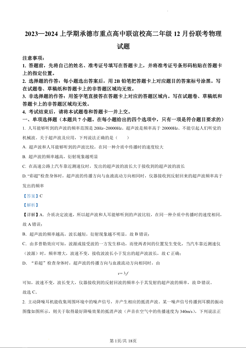 河北省承德市重点高中联谊校2023-2024学年高二上学期12月联考物理(精品解析版)