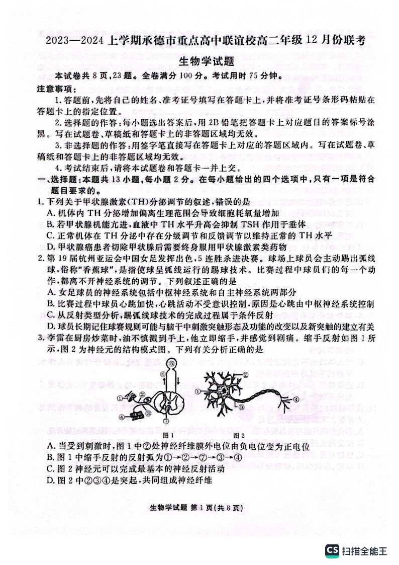 河北省承德市重点高中联谊校2023-2024学年高二上学期12月联考生物