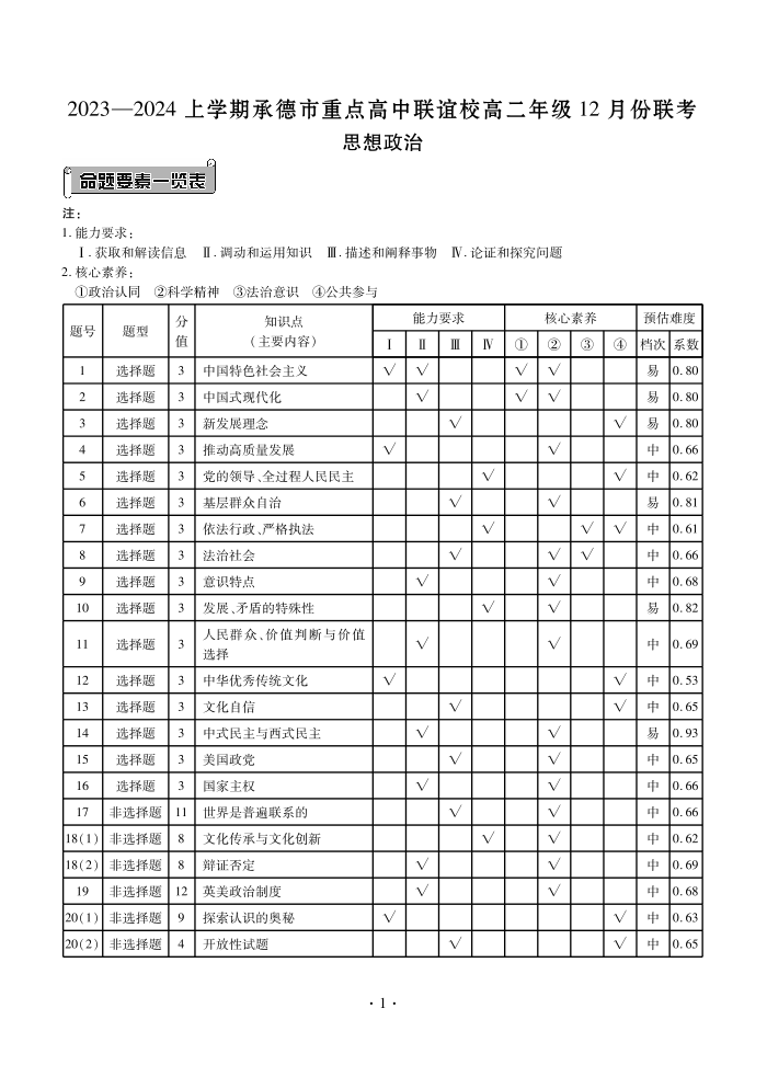 河北省承德市重点高中联谊校2023-2024学年高二上学期12月联考政治答案
