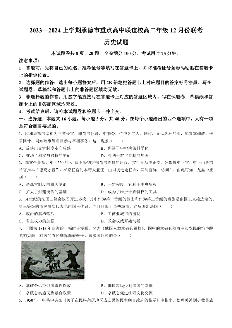 河北省承德市重点高中联谊校2023-2024学年高二上学期12月联考历史