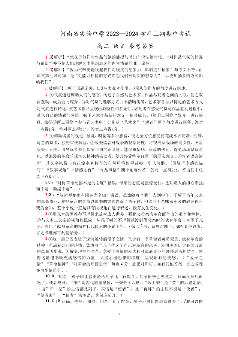 河南省实验中学2023-2024学年高二上学期期中考试语文答案