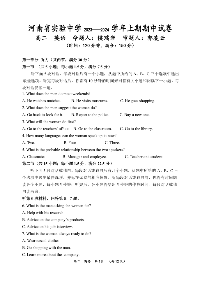 河南省实验中学2023-2024学年高二上学期期中考试英语