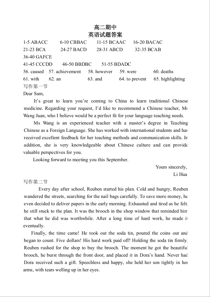 河南省实验中学2023-2024学年高二上学期期中考试英语答案