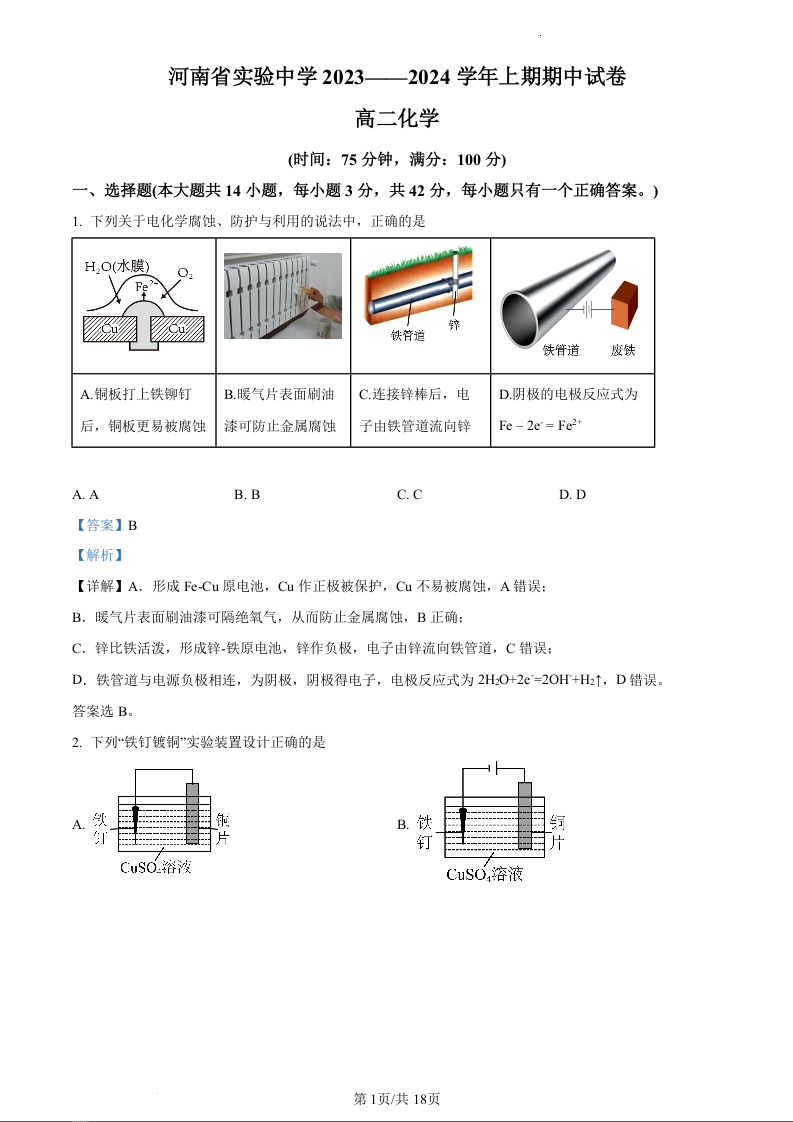 河南省实验中学2023-2024学年高二上学期期中考试化学(精品解析版)
