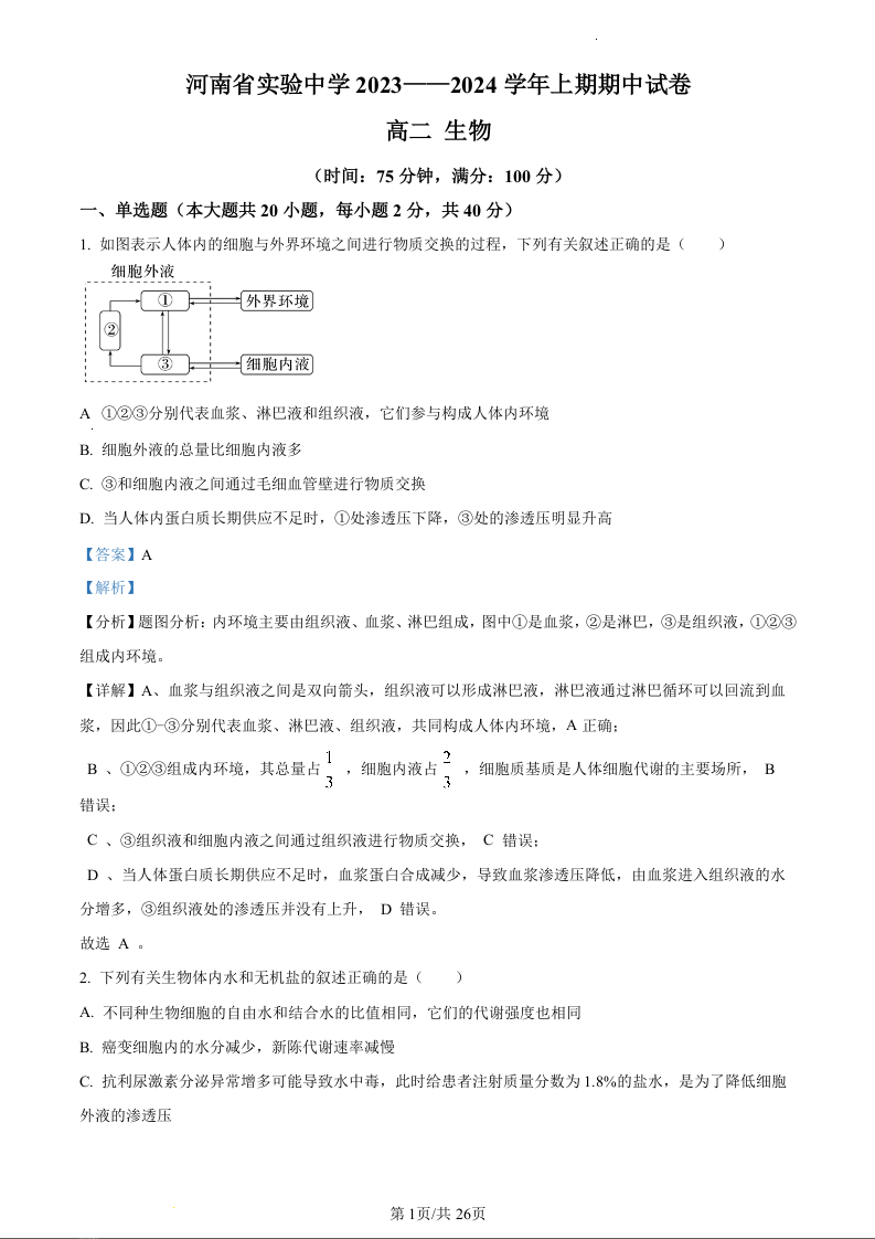 河南省实验中学2023-2024学年高二上学期期中考试生物(精品解析版)