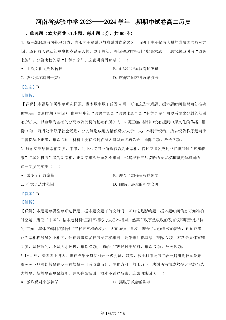 河南省实验中学2023-2024学年高二上学期期中考试历史(精品解析版)