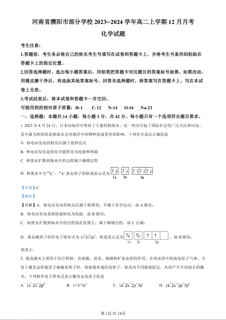 河南省濮阳市2023-2024学年高二上学期12月联考化学(精品解析版)