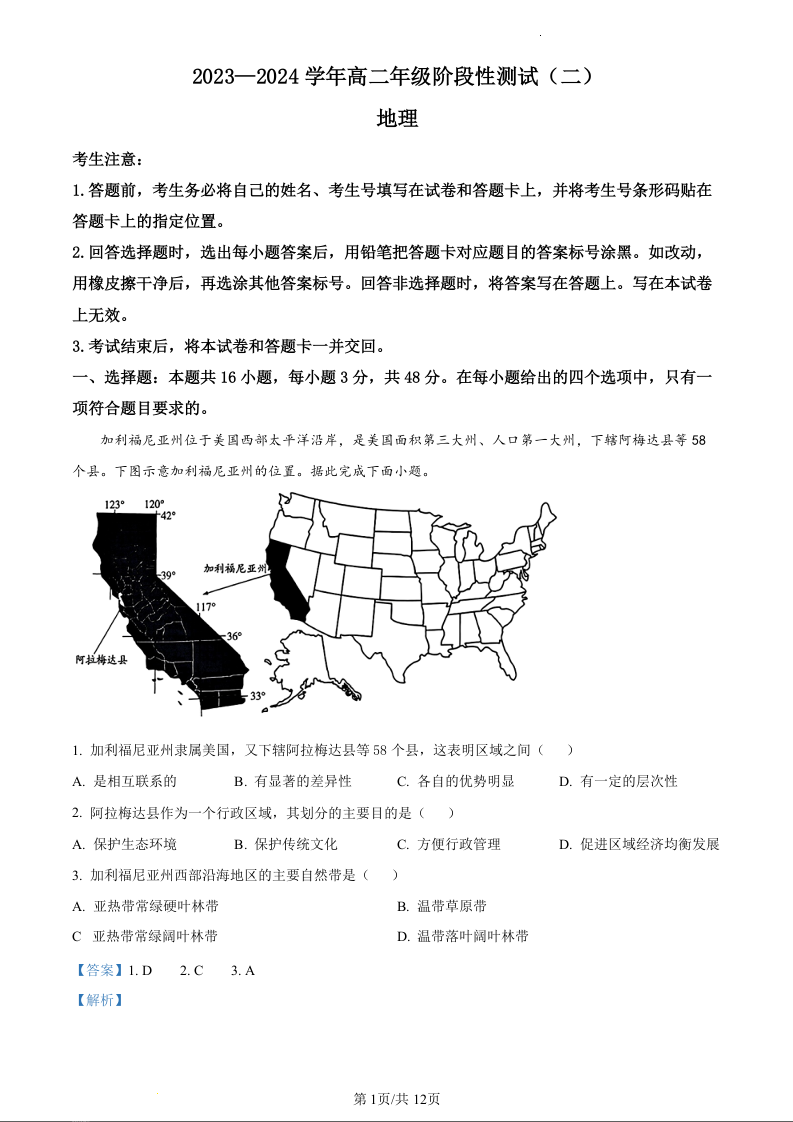 河南省濮阳市2023-2024学年高二上学期12月联考地理(精品解析版)