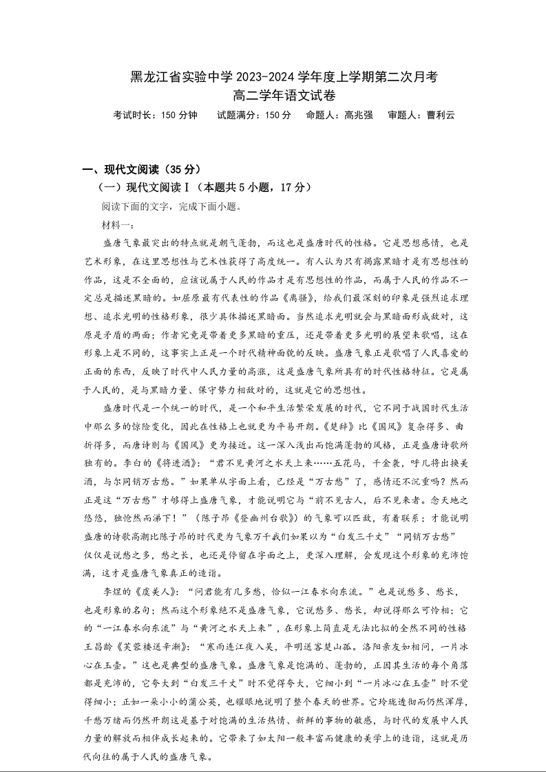 黑龙江省实验中学2023-2024学年高二上学期12月月考语文+答案