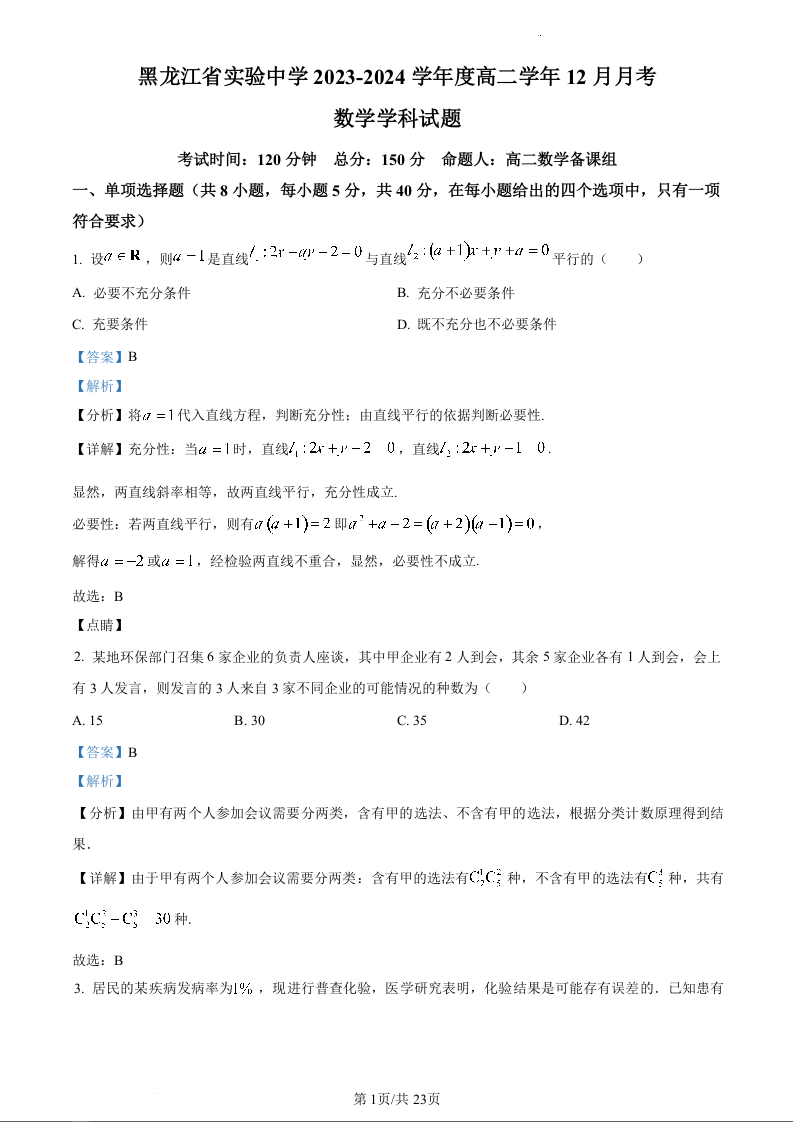 黑龙江省实验中学2023-2024学年高二上学期12月月考数学(精品解析版)