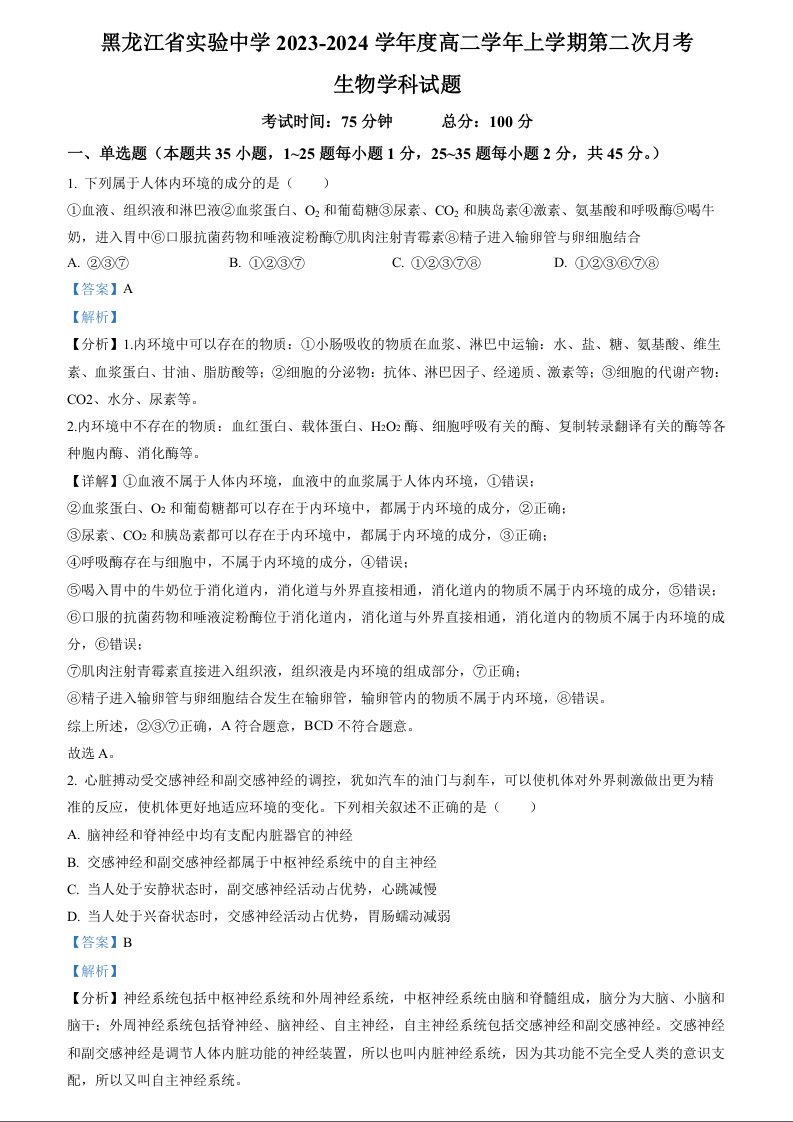 黑龙江省实验中学2023-2024学年高二上学期12月月考生物(精品解析版)