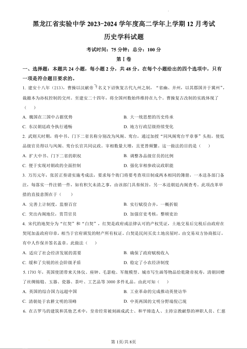 黑龙江省实验中学2023-2024学年高二上学期12月月考历史(原卷版)