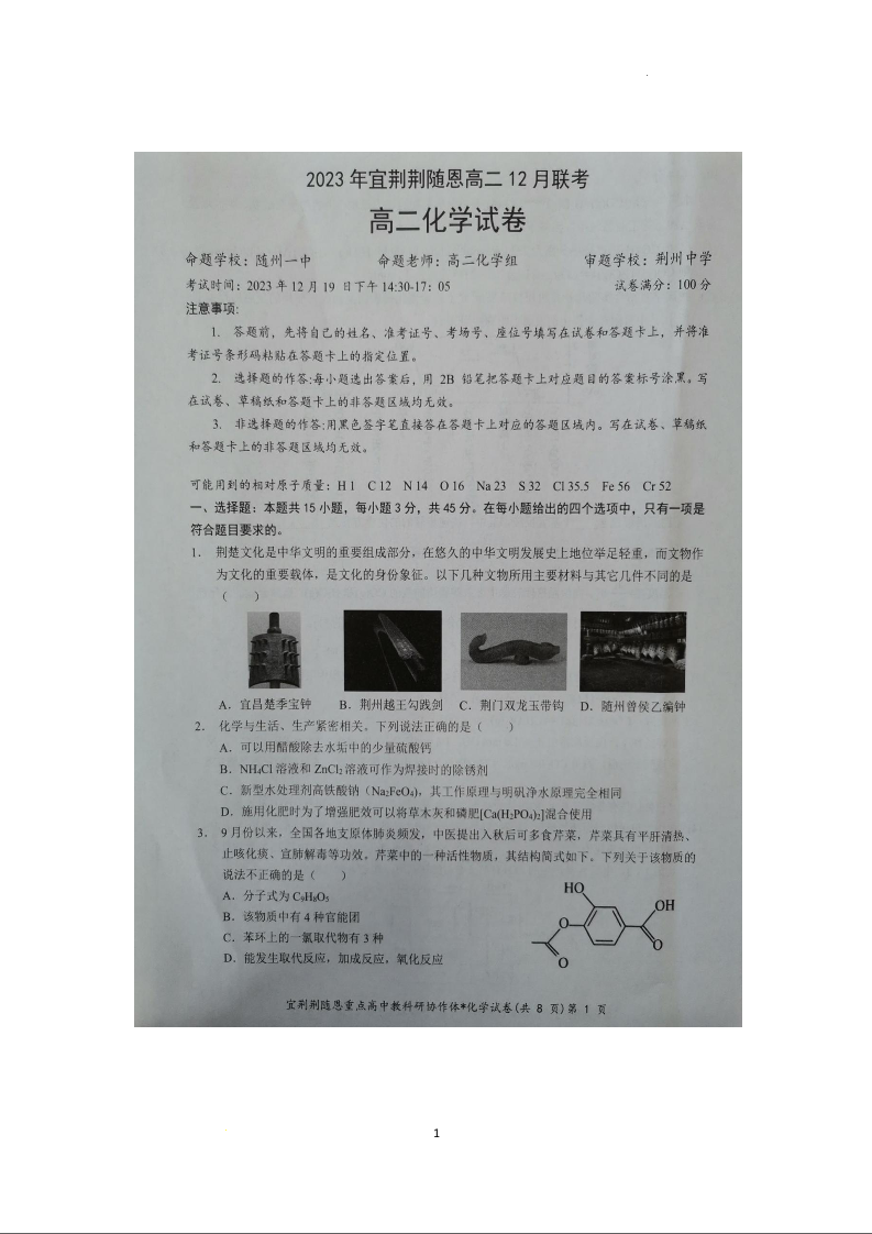 湖北省宜荆荆随恩2023-2024学年高二上学期12月联考化学