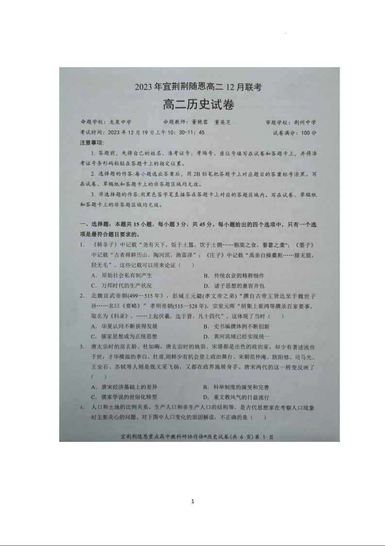 湖北省宜荆荆随恩2023-2024学年高二上学期12月联考历史