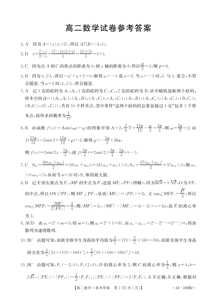 湖南省百校大联考2023-2024学年高二上学期12月月考数学答案