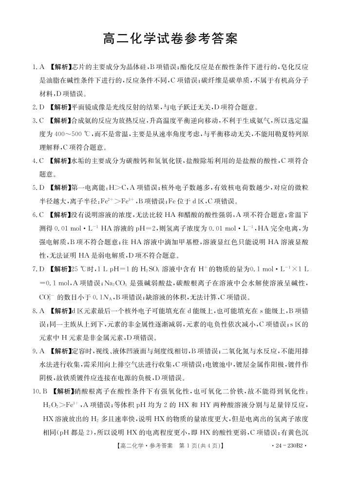 湖南省百校大联考2023-2024学年高二上学期12月月考化学答案