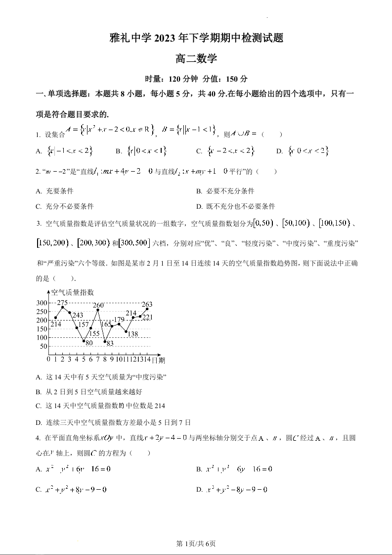 湖南省长沙市雅礼教育集团2023-2024学年高二上学期期中考试数学(原卷版)