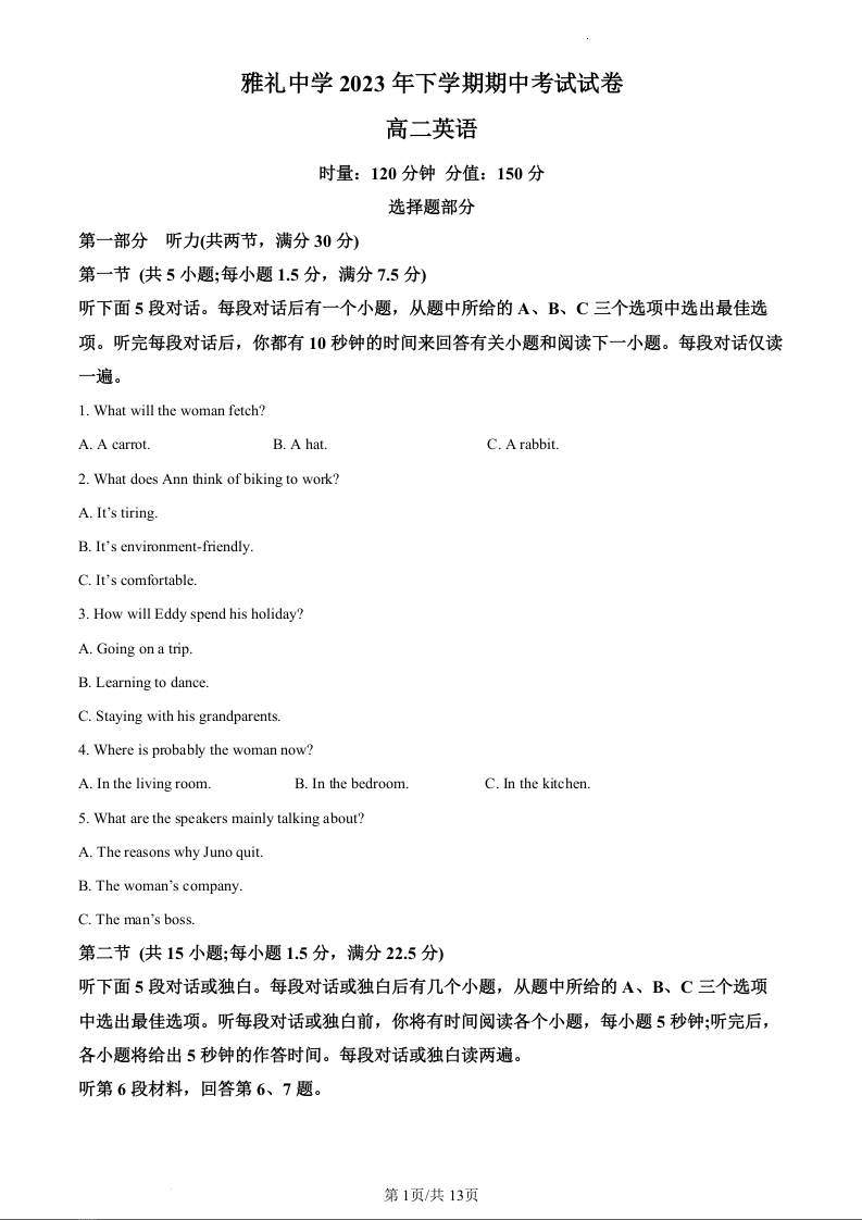 湖南省长沙市雅礼教育集团2023-2024学年高二上学期期中考试英语(原卷版)