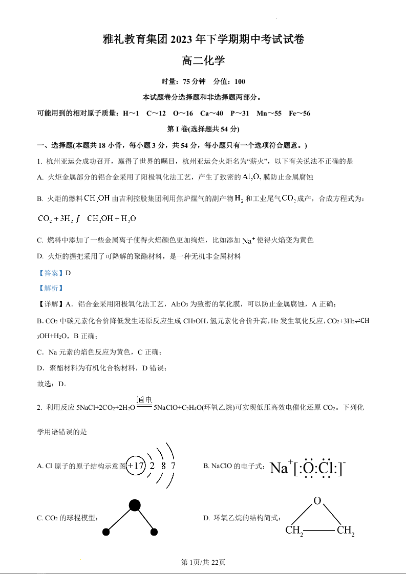 湖南省长沙市雅礼教育集团2023-2024学年高二上学期期中考试化学(精品解析版)