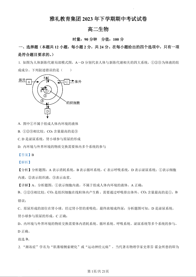 湖南省长沙市雅礼教育集团2023-2024学年高二上学期期中考试生物(精品解析版)