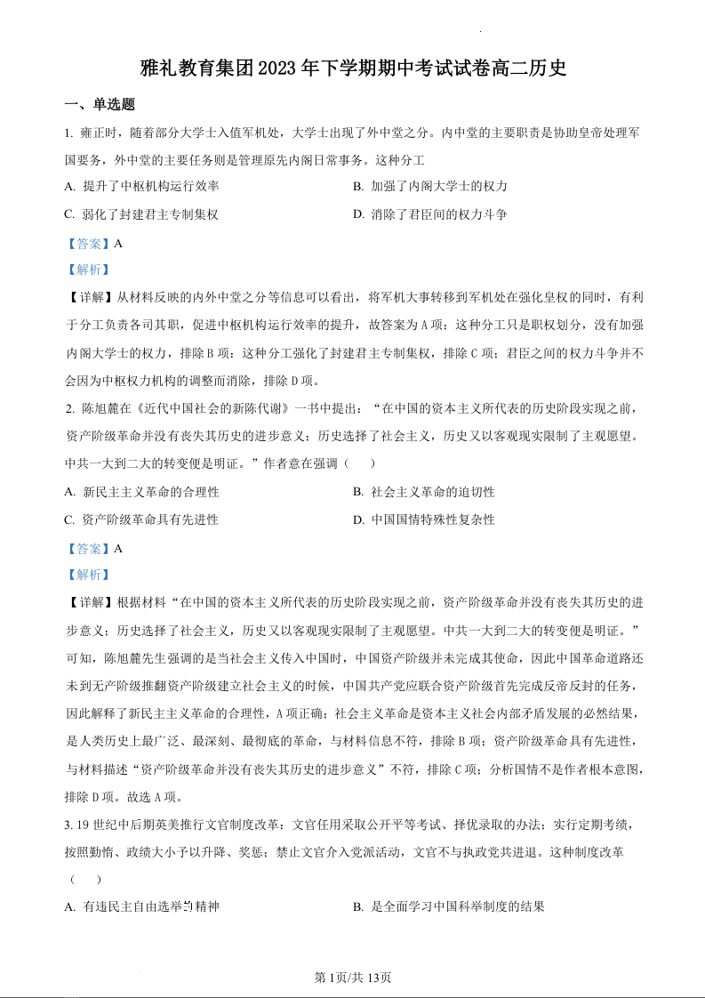 湖南省长沙市雅礼教育集团2023-2024学年高二上学期期中考试历史(精品解析版)