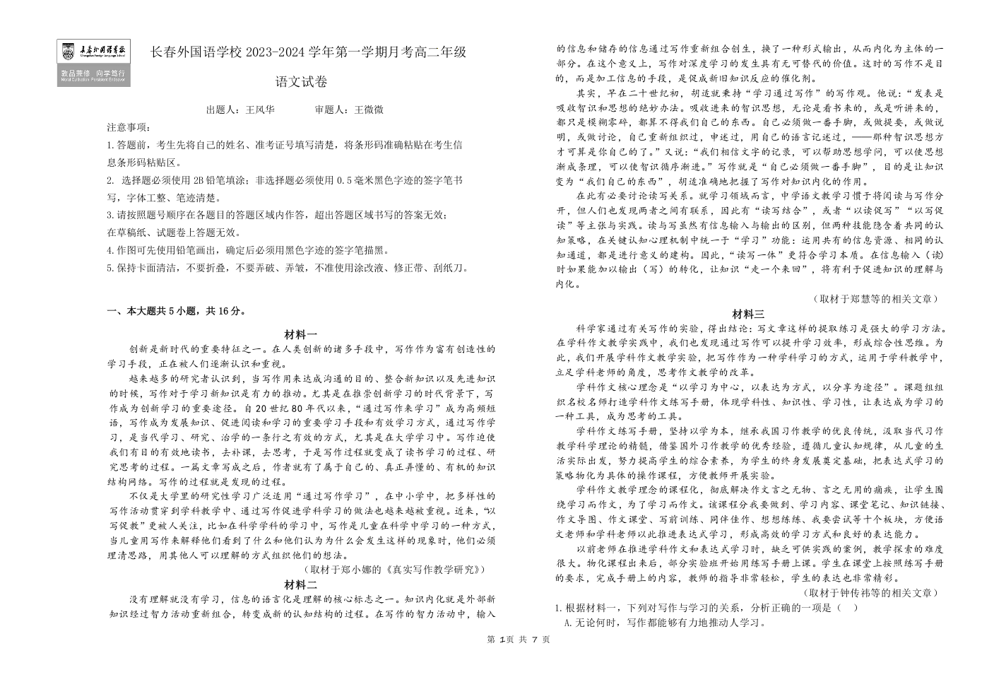 吉林省长春市长春外国语学校2023-2024学年高二上学期第二次月考语文+答案