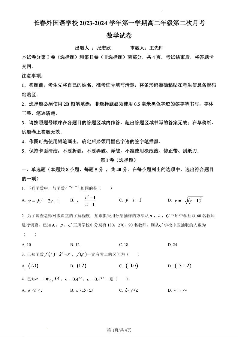 吉林省长春市长春外国语学校2023-2024学年高二上学期第二次月考数学(原卷版)