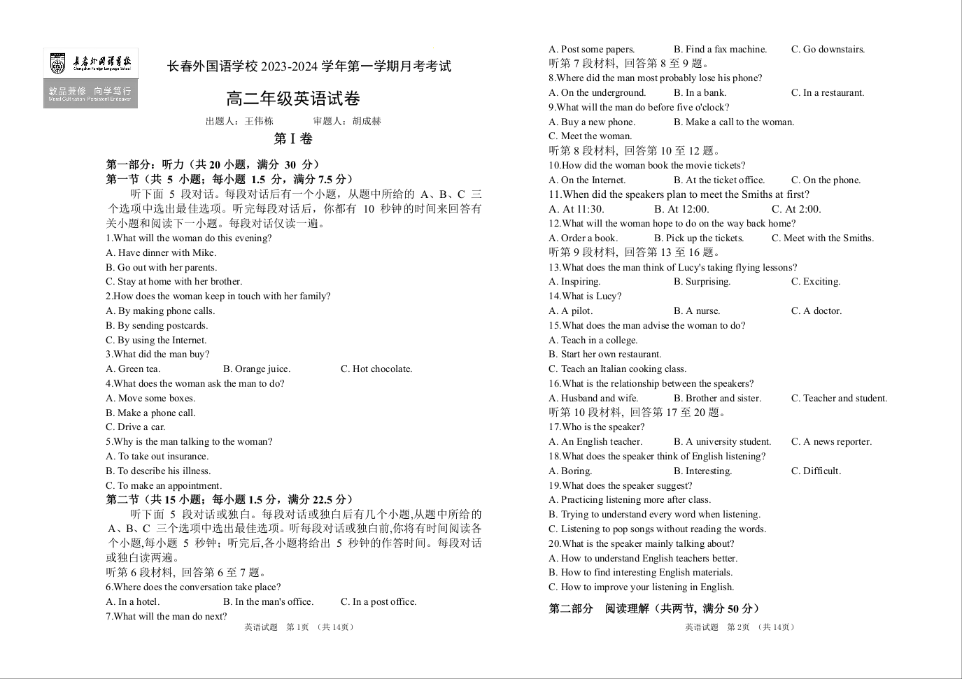 吉林省长春市长春外国语学校2023-2024学年高二上学期第二次月考英语+答案