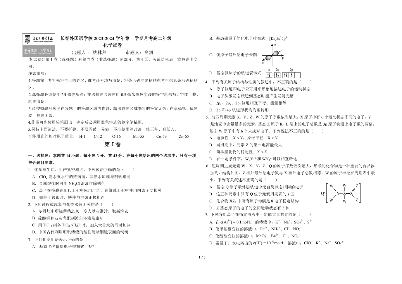 吉林省长春市长春外国语学校2023-2024学年高二上学期第二次月考化学+答案
