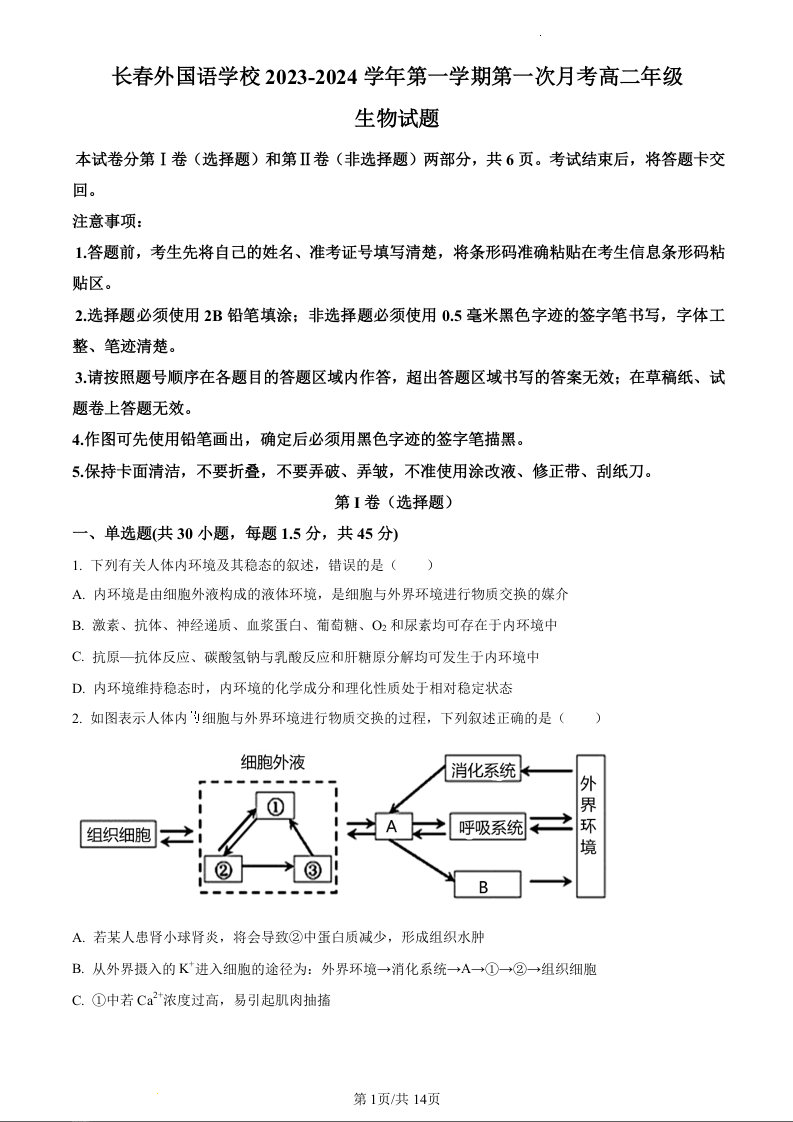吉林省长春市长春外国语学校2023-2024学年高二上学期第二次月考生物(原卷版)