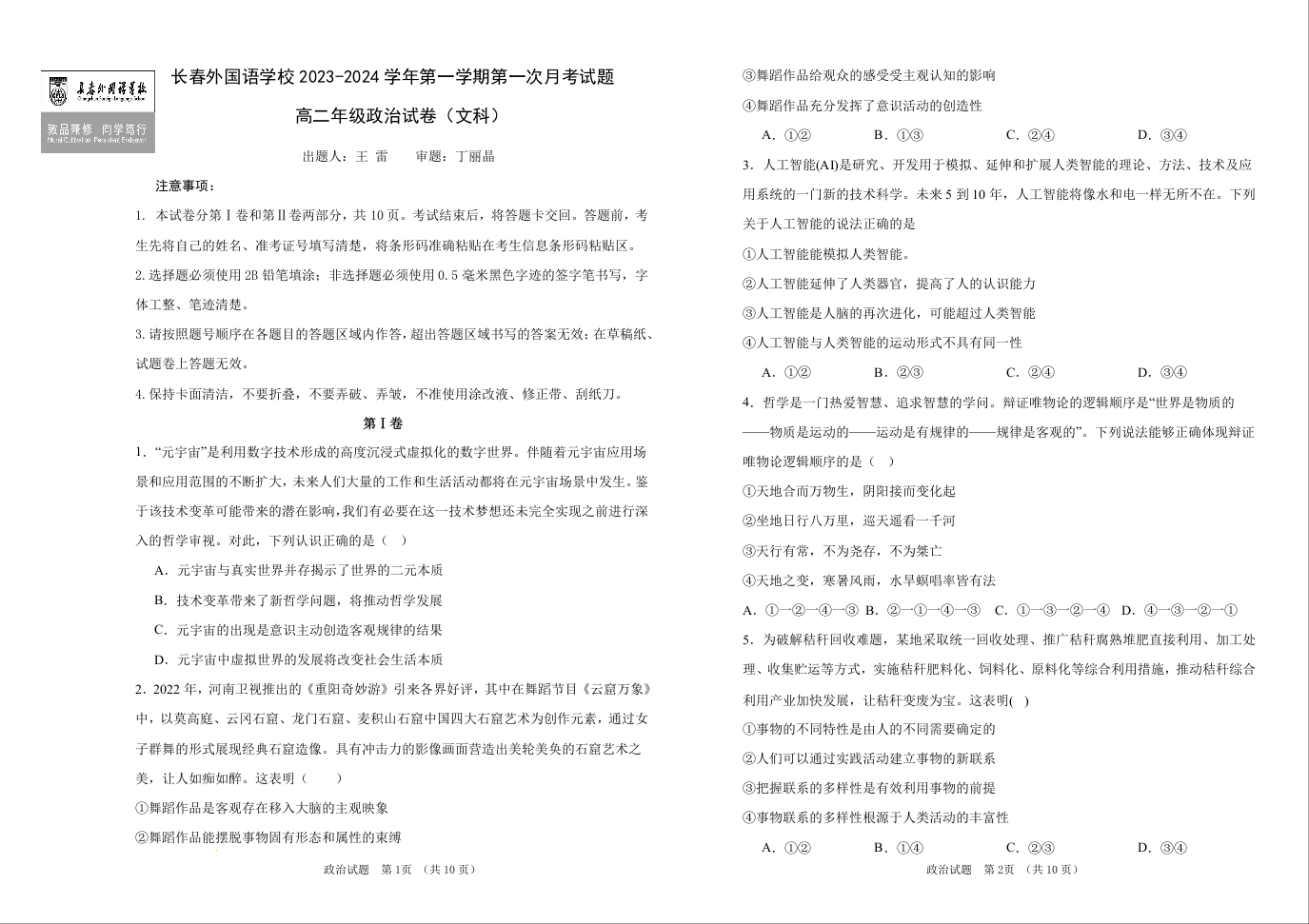 吉林省长春市长春外国语学校2023-2024学年高二上学期第二次月考政治+答案