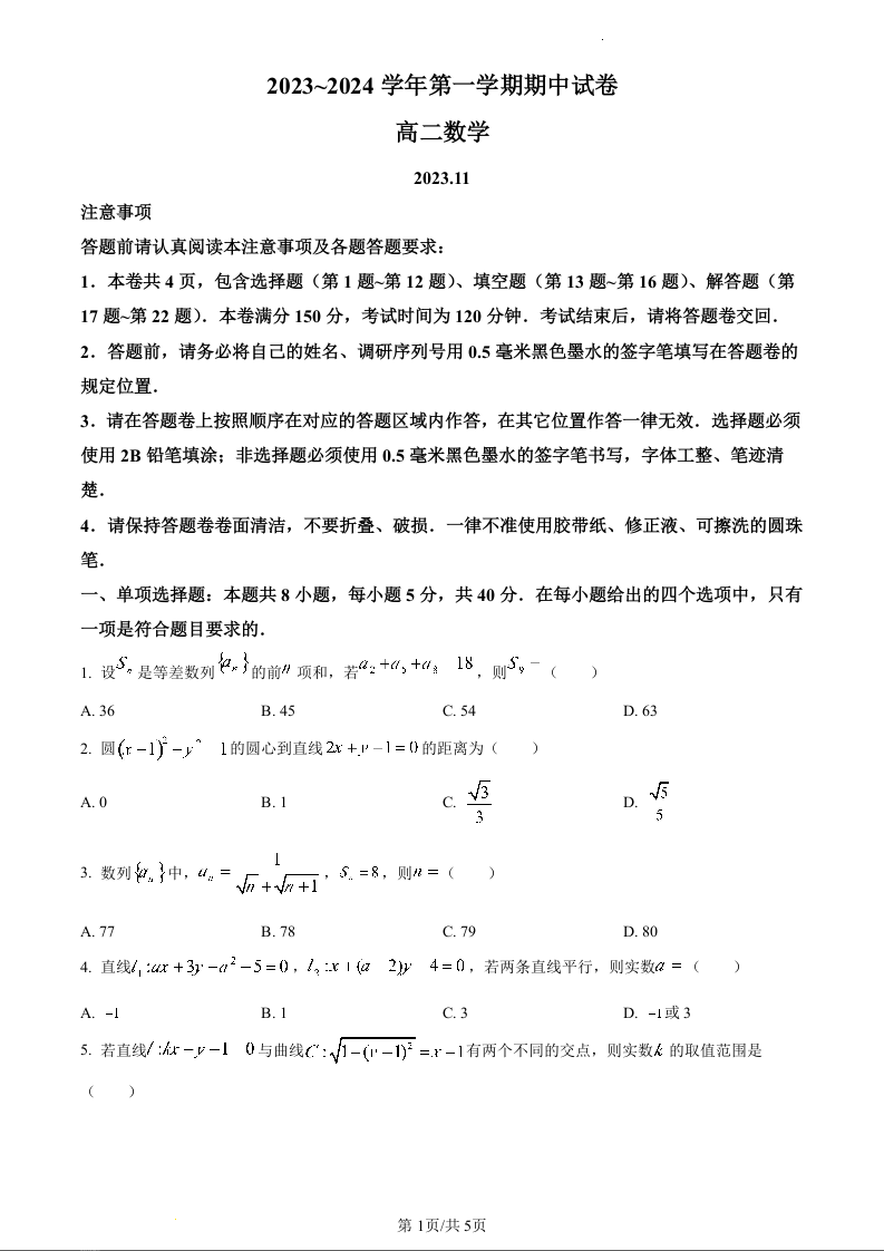 江苏省常熟市2023-2024学年高二上学期期中考试数学(原卷版)