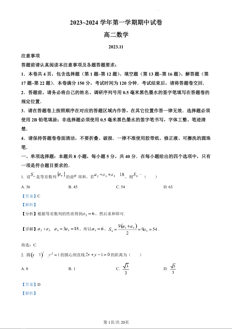 江苏省常熟市2023-2024学年高二上学期期中考试数学(精品解析版)