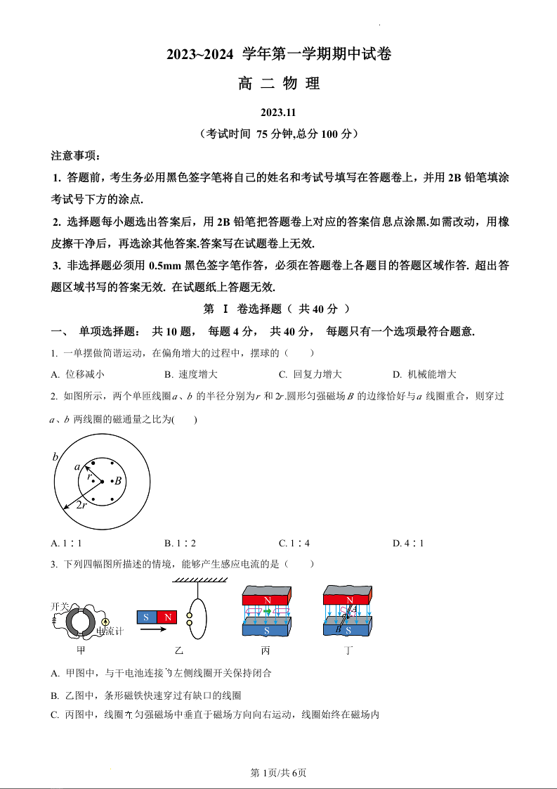 江苏省常熟市2023-2024学年高二上学期期中考试物理(原卷版)