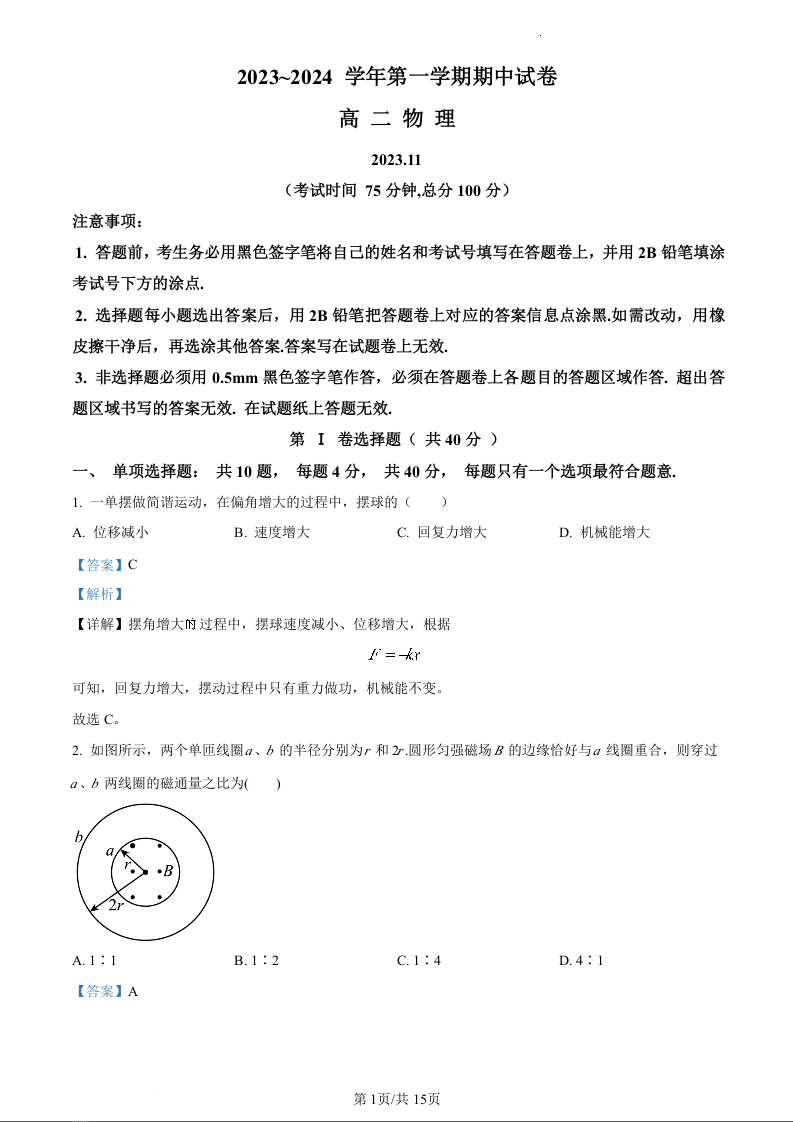 江苏省常熟市2023-2024学年高二上学期期中考试物理(精品解析版)