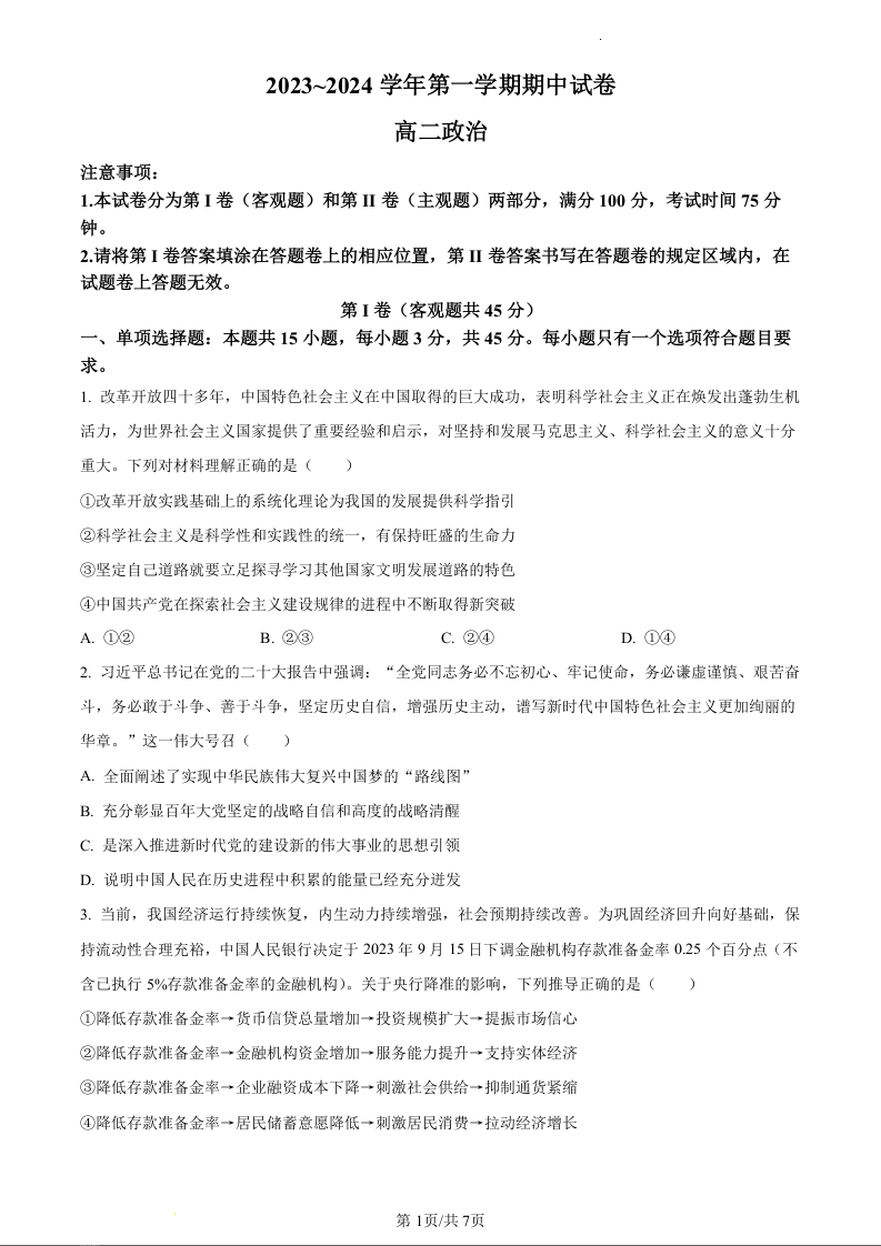 江苏省常熟市2023-2024学年高二上学期期中考试政治(原卷版)