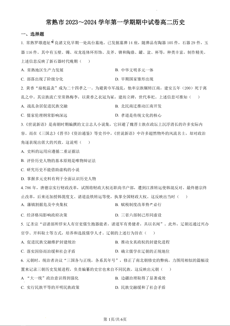 江苏省常熟市2023-2024学年高二上学期期中考试历史(原卷版)