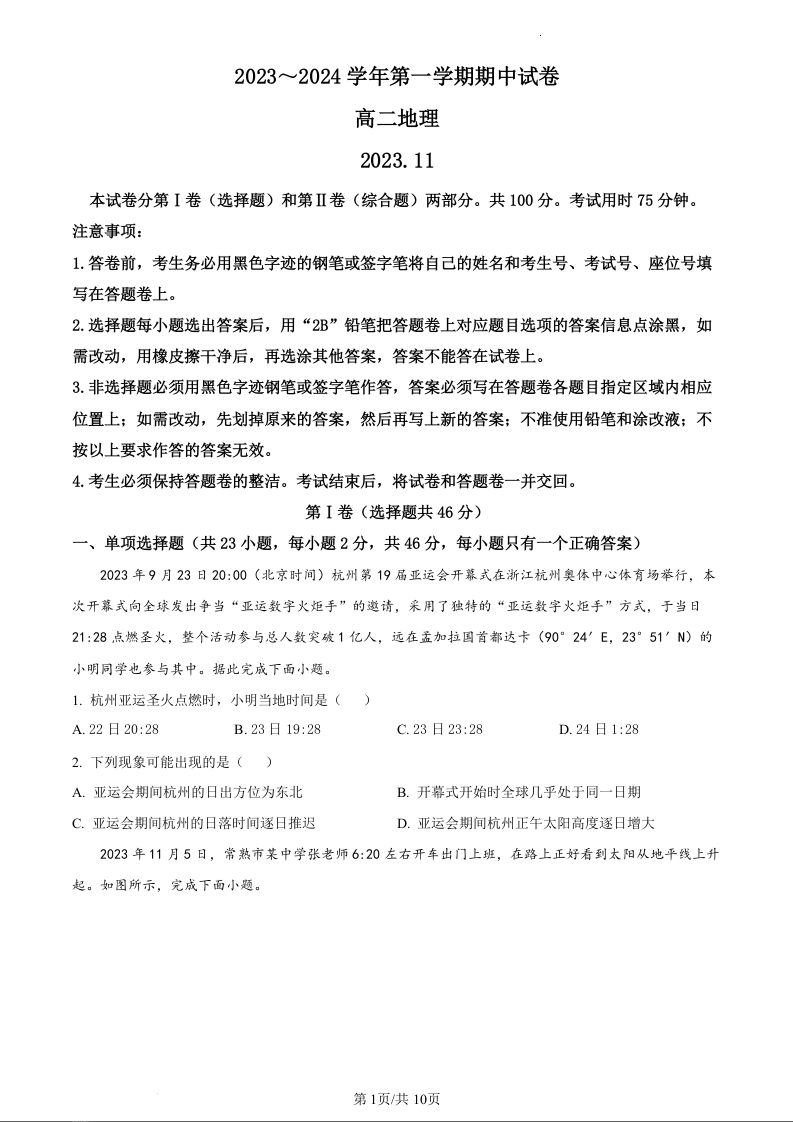 江苏省常熟市2023-2024学年高二上学期期中考试地理(原卷版)