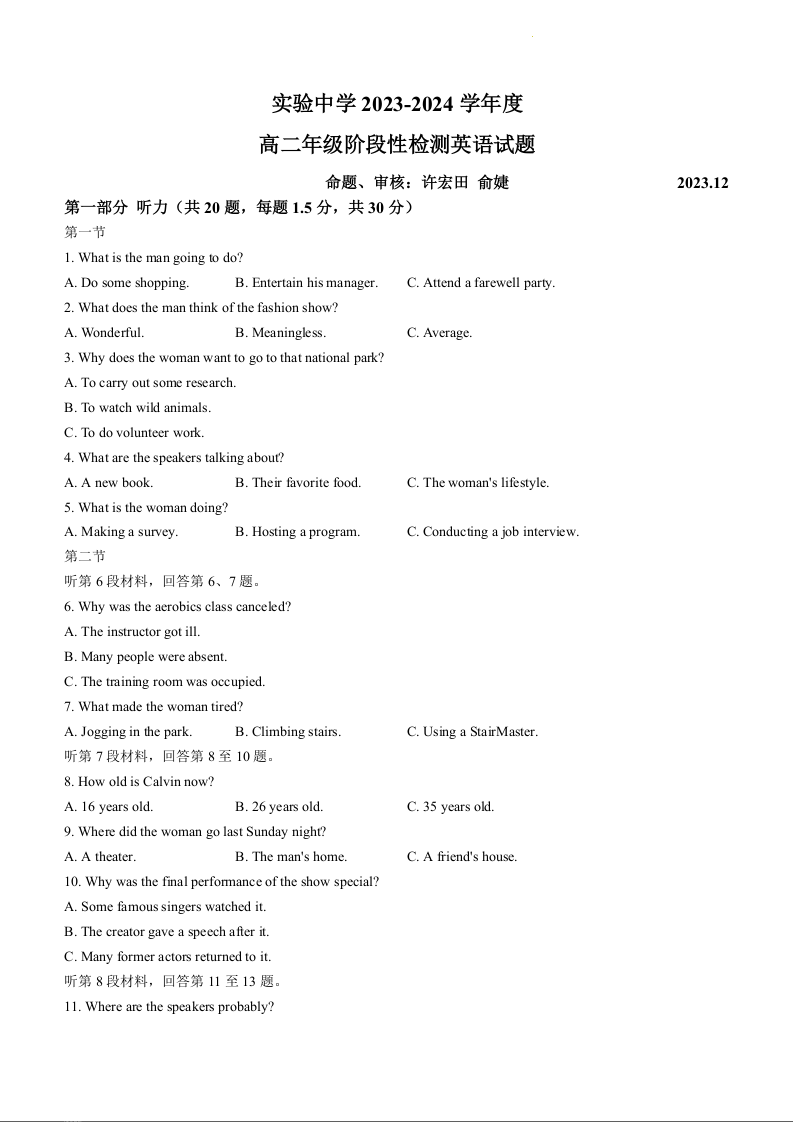 江苏省南通市海安市实验中学2023-2024学年高二上学期12月月考英语