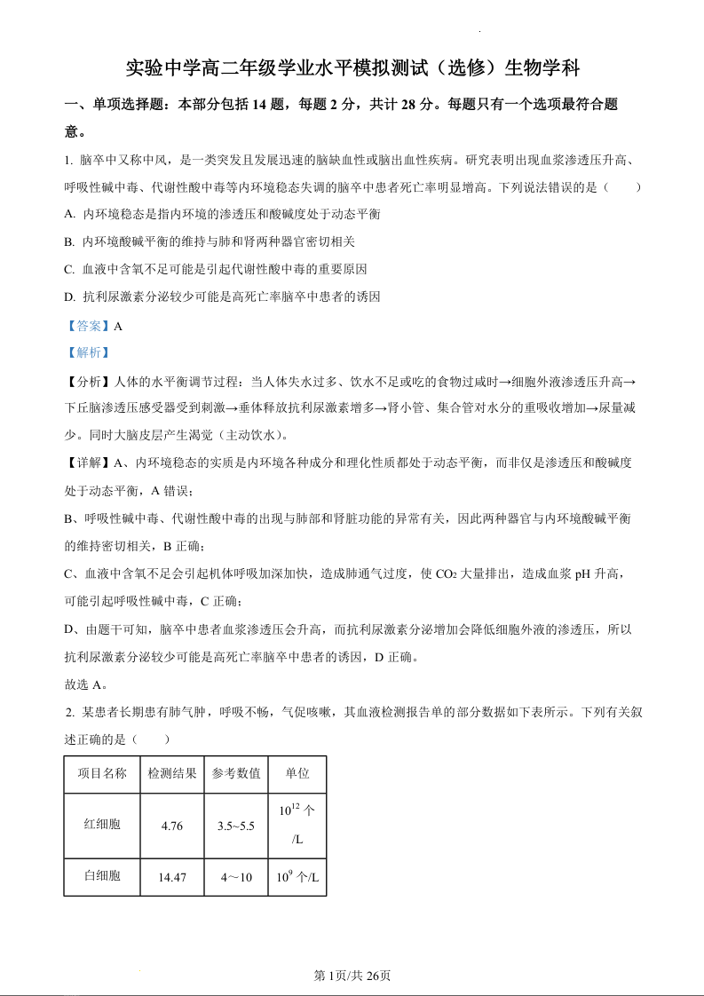 江苏省南通市海安市实验中学2023-2024学年高二上学期12月月考生物(精品解析版)