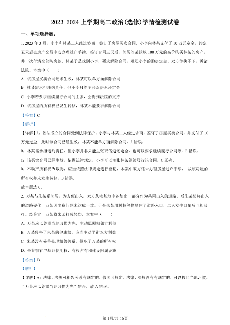 江苏省南通市海安市实验中学2023-2024学年高二上学期12月月考政治(精品解析版)