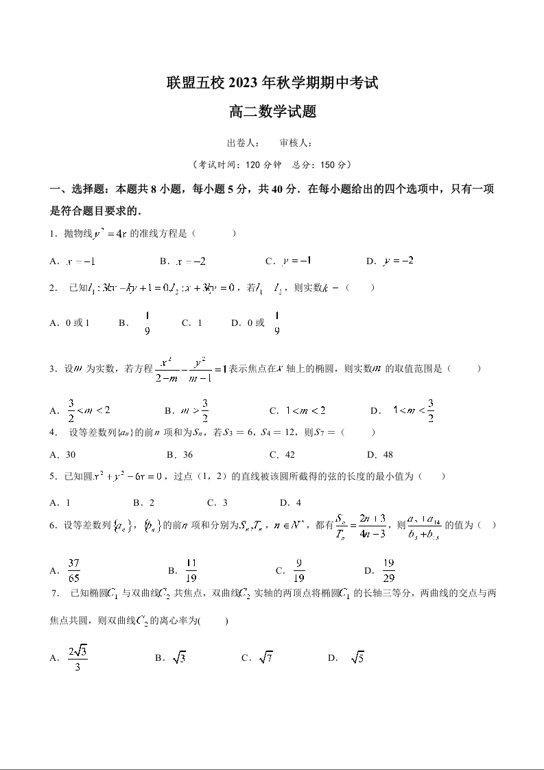江苏省泰州市联盟五校2023-2024学年高二上学期期中考试数学